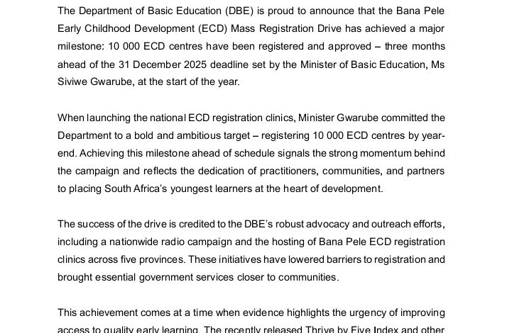 The Department of Basic Education (DBE) is delighted to share some fantastic news regarding our Bana Pele Early Childhood Development (ECD) Mass Registration Drive. We have successfully registered and approved a remarkable 10,000 ECD centres across the country, reaching this significant goal three months ahead of our original target date of 31 December 2025. This achievement truly shows our commitment to giving our youngest children the best possible start in life.