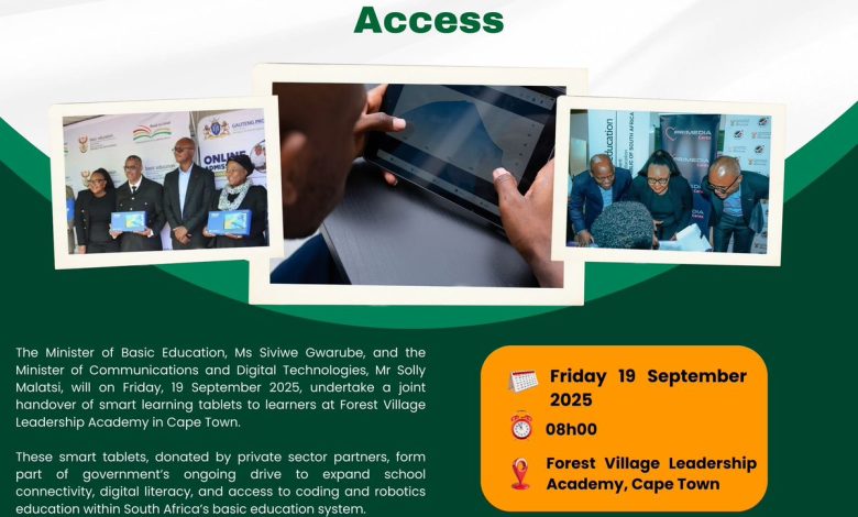 The Department of Basic Education (DBE) is excited to announce a joint event where the Minister of Basic Education, Ms Siviwe G, and the Minister of Communications and Digital Technologies, Mr Solly Malatsi, will personally hand over smart learning tablets. This important event is scheduled for Friday, 19 September 2025, and will take place at the Forest Village Leadership Academy, where learners will receive these valuable educational tools.
